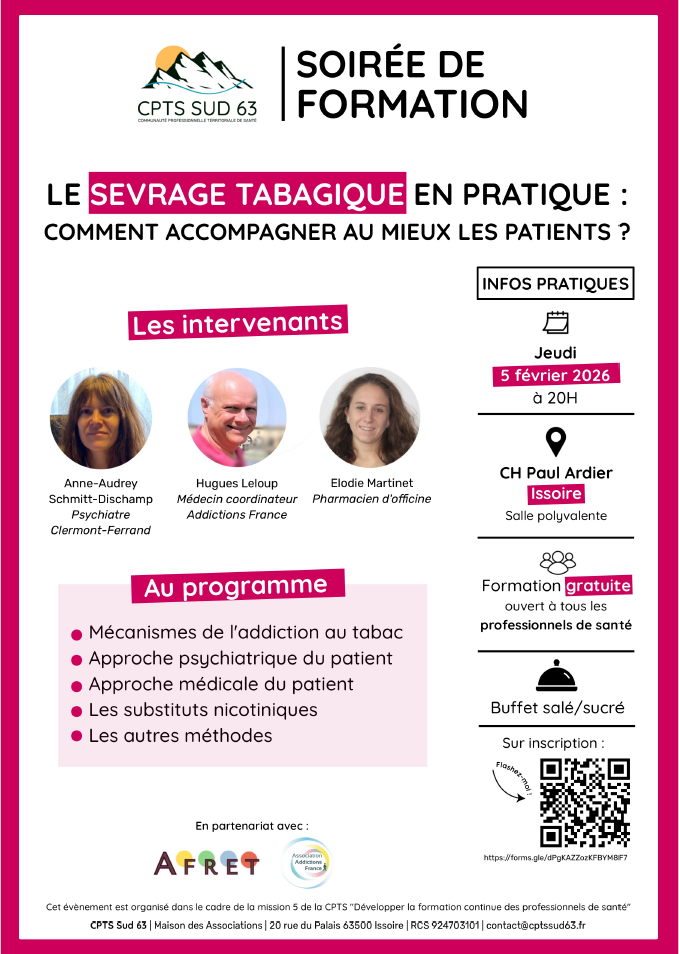 – Au Centre Hospitalier d’Issoire – Soirée gratuite ouverte à tous les professionnels de santé du territoire (et leur équipe) – Une intervention pluriprofessionnelle : psychiatre, médecin généraliste et pharmacien. – Buffet sucré/salé – Sur inscription obligatoire : https://forms.gle/dPgKAZZozKFBYM8F7